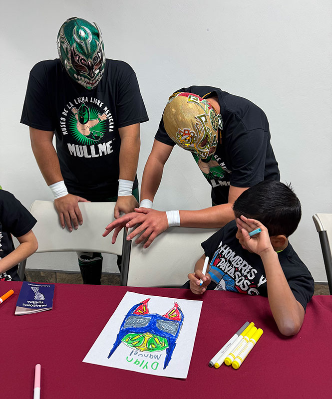 Durante su visita, los niños disfrutaron de un recorrido guiado por ambos museos, donde pudieron conocer parte de la historia y las colecciones que resguardan estos espacios culturales. Sin embargo, la experiencia guardaba una sorpresa especial: un convivio con los luchadores Khaball, Crimen y Aztec Fly.